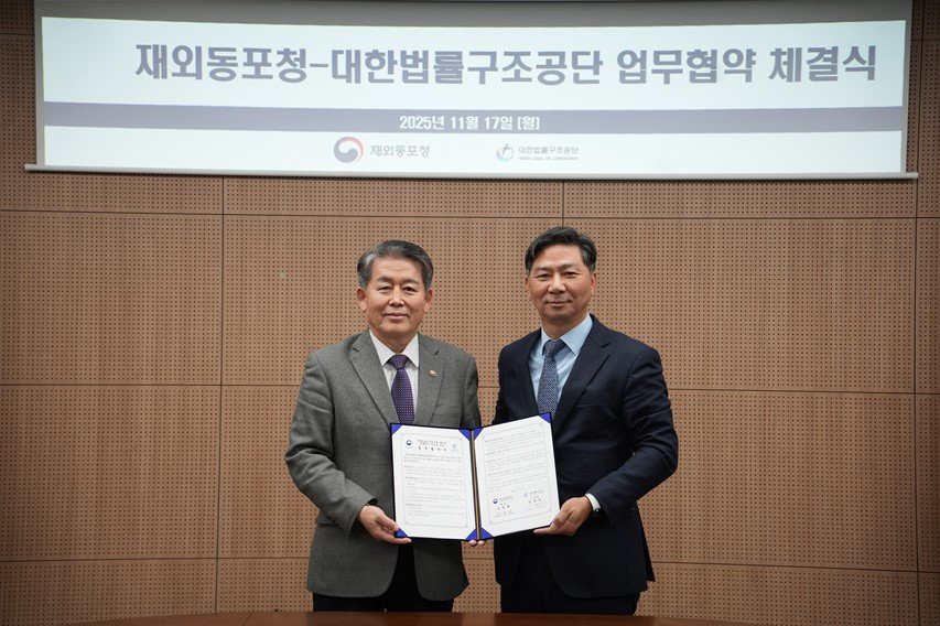 대한법률구조공단(이사장 김영진)이 17일 재외동포청(청장 김경협)과 재외동포의 권익보호 강화 및 법률복지 증진을 위한 업무협약을 체결했다고 밝혔다.이번 협약은 지속적으로 증가하고 있는 국내 귀환 동포의 법률복지 사각지대를 해소하기 위해 마련됐다.최근 한국에서 노후를 보내려는 동포들이 늘어남에 따라, 생활법률·주거·재산 등 법적 문제에 대한 상담과 지원 수요도 빠르게 증가하고 있다. 재외동포의 ‘역이민(逆移民)’이 꾸준히 증가하면서 이들의 안정적 정착을 지원할 제도적 장치의 필요성이 커지고 있다고 공단은 밝혔다.협약식은 재외동포청 대회의실에서 진행됐다. 공단 이사장과 재외동포청 청장을 비롯한 양 기관 관계자들이 참석했다.주요 협약 내용은 △ 재외동포의 정당한 권리보호를 위한 상담 등 법률서비스 지원 및 연계 △ 국내귀환동포의 모국 사회 적응을 위한 법문화교육 지원 △ 재외동포 법률구조 사업 활성화를 위한 홍보 및 유관 행사 참여 등이다. 김영진 공단 이사장은 “귀환 동포의 모국사회 적응을 위한 법문화 교육 지원과 재외동포단체와의 교류 협력 활성화를 통해 전 세계 어디서든 대한민국 국민이 공정한 법의 울타리 안에서 보호받는 법률복지 체계를 함께 구축하겠다”고 밝혔다.박태근 기자 ptk@donga.com}