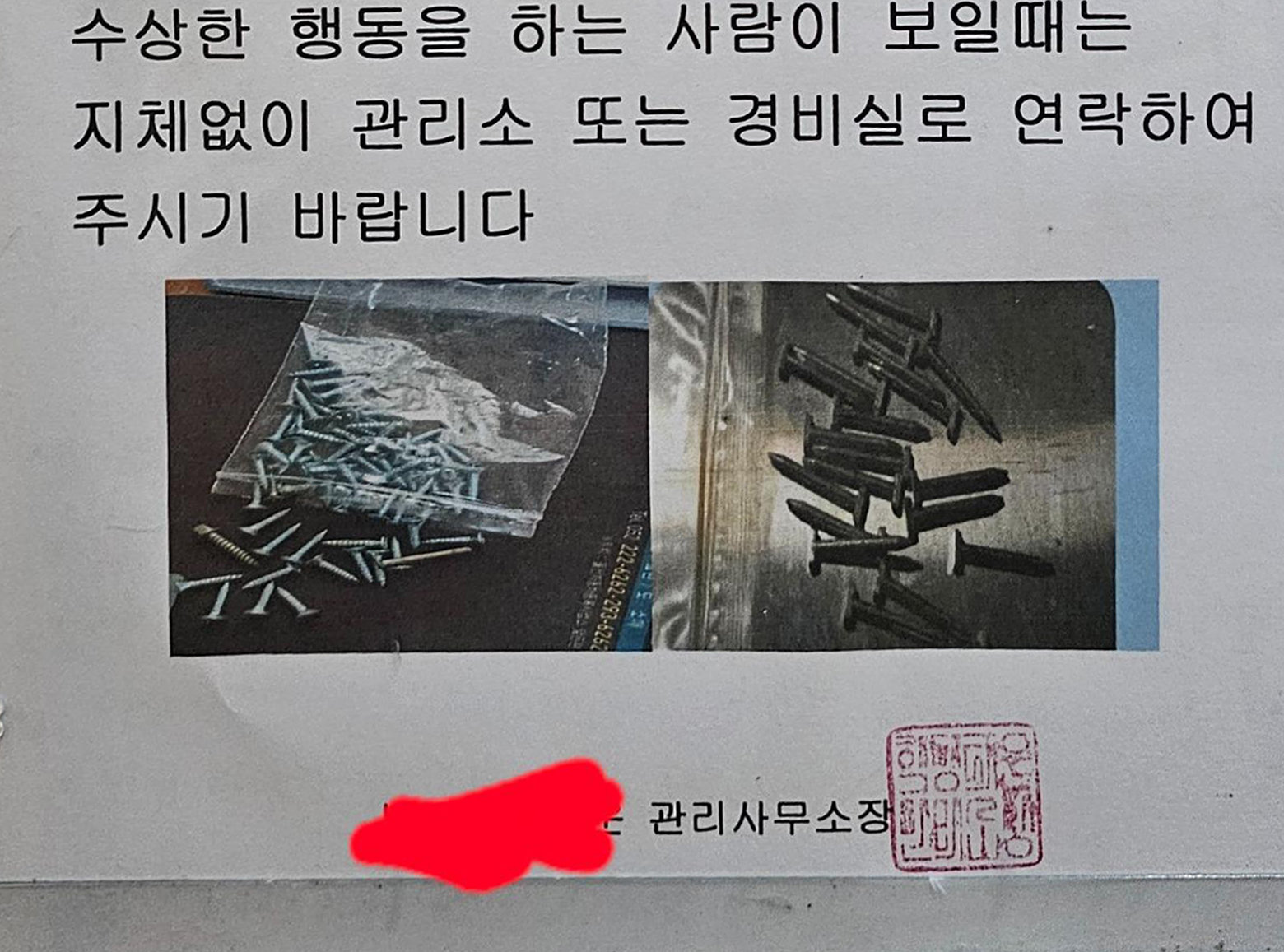 울산의 한 아파트 주차장에 누군가 수십 개의 나사못을 뿌리고 달아나는 일이 수개월째 반복돼 입주민들이 극심한 불안에 시달리고 있다. 피해 주민들은 “고의성이 뚜렷한 차량 테러”라며 대응을 촉구하고 있지만, 범인은 아직 검거되지 않은 상태다.● 올해 초부터 반복된 ‘나사못 테러’… 수십 개씩 뿌려져제보자 A 씨는 최근 온라인 커뮤니티 보배드림에 글을 올려 “올해 초부터 아파트 단지 주차장 입구나 주차된 차 앞에 누군가 고의로 뿌려놓은 것처럼 나사못이 수십 개씩 한꺼번에 발견되고 있다”고 밝혔다. 나사못의 양과 위치로 볼 때 단순 낙하가 아닌 ‘의도적 살포’라는 판단이 이어지고 있다.이 아파트는 울산광역시의 30년 된 구축 단지로 총 288세대가 거주 중이다. 일부 주민은 실제로 타이어가 펑크 나는 피해를 입어 불안은 더욱 커진 상태다.● CCTV엔 외부인 포착…차량 향해 ‘뿌리고’ 사라져CCTV 확인 결과 외부인이 단지에 들어와 주차된 차량을 향해 뭔가를 뿌리고 빠져나가는 장면이 포착됐다. A 씨는 “밤 시간대 정문으로 들어와 후문으로 나가는 모습이 확인됐다”고 설명했다.입주민들은 매번 4개 바퀴 아래를 확인하지 않고는 차량을 움직일 수 없는 상황에 놓였다. 단지를 지날 때마다 바닥과 차량 전방을 살피느라 일상적인 이동에도 큰 불편을 겪고 있다는 호소가 이어졌다.A 씨는 “경찰도 잡기 힘들다고 하는데, 한동안 잠잠하다가 얼마 전부터 또 같은 테러가 발생하고 있다”고 전했다.● 관리사무소 긴급 공지…“출차 전 바닥 반드시 확인”관리사무소는 공지문을 통해 “출차 전 차량 주변과 골목길 바닥을 반드시 확인해달라”고 당부했다. 아울러 수상한 행동을 보이는 사람이 있을 경우 즉시 경비실에 신고해달라고 강조했다. 범인이 외부인으로 확인된 만큼 단지 내 방범 강화와 경찰 수사 확대가 필요하다는 여론도 커지고 있다. 누리꾼들은 “CCTV 다 뒤지면 찾을 수 있을텐데 경찰의 의지가 없는것 아니냐”며 “카센터나 타이어집 등도 조사해 봐야 한다”고 지적했다.박태근 기자 ptk@donga.com}