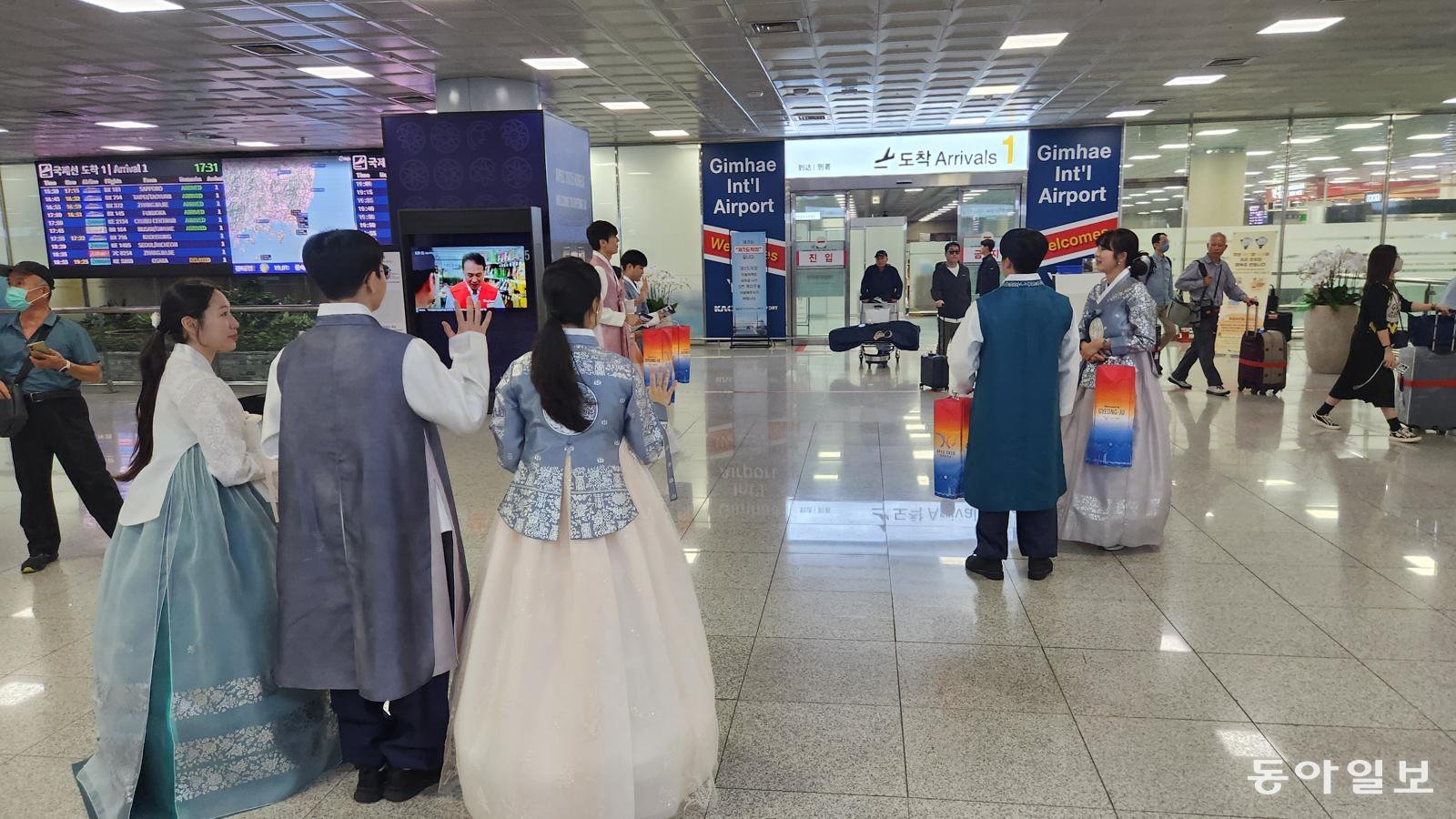 25일 오후 부산 강서구 김해국제공항과 경북 포항경주공항 등 주요 공항은 아시아태평양경제협력체(APEC) 참석자와 관광객을 맞이하는 사람들로 붐볐다. 한복을 곱게 차려 입고 청사초롱을 든 환영단은 물론, 인기 애니메이션 ‘케이팝 데몬 헌터스(케데헌)’ 속 저승사자 복장을 한 안내 요원들도 눈길을 끌었다.이날 김해국제공항에서는 파스텔빛 한복을 입은 청년 10여 명이 입국장 게이트 앞에서 외국인 방문객을 향해 밝은 미소로 인사했다. 한 손에는 주황빛 청사초롱을 들고, 다른 손을 흔들며 환영 인사를 전했다. 입국 심사를 마친 외국인들은 “뷰티풀(Beautiful)”을 외치며 엄지를 들어 보이거나, 캐리어를 세워두고 청년들과 기념사진을 찍기도 했다.이들은 다음 달 초까지 진행되는 APEC 정상회의 환영 캠페인에 참여 중인 대학생 아르바이트생들이다. 행사에 참여한 20대 남성은 “외국인이 한국에 첫발을 디딜 때부터 좋은 인상을 받을 수 있도록 최선을 다하고 있다”고 말했다.‘케데헌’의 인기 캐릭터 ‘사자보이즈’ 복장을 한 청년들도 눈에 띄었다. 이들은 공항 내 문화체육관광부 산하 한국방문의해위원회가 마련한 홍보 부스에서 외국인을 안내했다. 부스에는 호랑이와 까치가 그려진 포토존이 마련돼 외국인 관광객들이 기념사진을 찍을 수 있었다. 대합실 곳곳에는 ‘Welcome to APEC Korea 2025’ 문구가 적힌 대형 환영 메시지도 설치됐다. 외부 셔틀버스 승차장에선 개최지 경북 경주를 홍보하는 첨성대·석굴암 사진을 볼 수 있었다. 정상회의 주간(27~31일)을 앞두고 공항 보안도 강화됐다. 형광 조끼를 입은 경찰이 순찰을 늘렸고, 보안요원 수도 평소보다 많아졌다. 김해공항 관계자는 “보안 절차 강화로 수속이 지연될 수 있다”며 “이용객은 평소보다 일찍 도착하는 게 좋다”고 당부했다. 부산=김화영 기자 run@donga.com}
