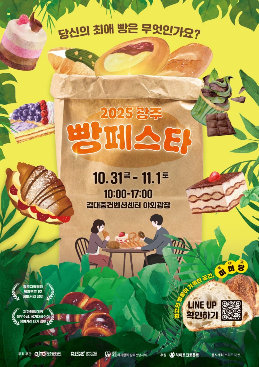 ‘2025 광주 빵 페스타’가 31일부터 11월 1일까지 광주 김대중컨벤션센터 야외광장에서 개최된다.광주 최초의 베이커리 축제로 지역 로컬 베이커리와 시민, 관광객이 함께 즐기는 체험형 미식문화 축제다. 광주를 대표하는 베이커리들을 ‘미미당’이라는 광주형 브랜드로 통합해 ‘빵빵한 유잼도시 광주’, ‘빵으로 여행하는 도시 광주’ 콘셉트로 기획됐다.베비에르, 홀리데이인 광주, 윤슬베이커리 등 24개 광주 대표 베이커리에서 100여 종 빵을 선보인다. 행사 기간 광주 제과·제빵 명장인 브레드세븐의 마칠석 명장을 초청, 지역 대학생·시민이 함께하는 토크콘서트를 마련했다. 지역 소상공인과 함께하는 플리마켓도 개최될 예정이다.하이트진로음료 부스에서는 음료를 선착순 무료 증정하며 광주김치축제 및 김대중컨벤션센터 방문객을 대상으로 ‘1만원 이상 구매 시 10% 할인 쿠폰’도 제공한다. 관람객 교통편의를 위해 김치축제 현장(광주시청), 유스퀘어터미널, 국립아시아문화전당과 김대중컨벤션센터를 오가는 광주투어버스(DRT)를 상시 운영한다.정승호 기자 shjung@donga.com}
