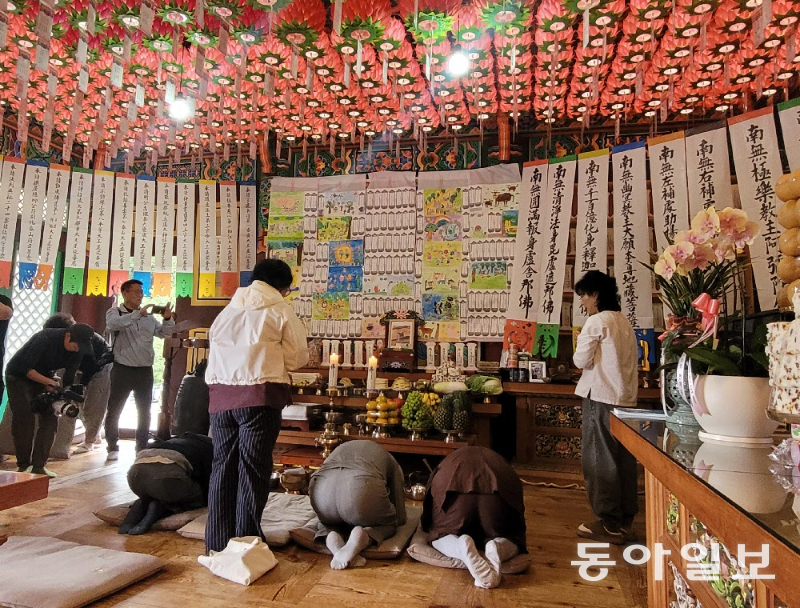 “나무 극락도사 아미타불(아미타 부처님께 귀의합니다)”, “왈왈!”“나무 접인망령 인로왕보살(망령을 인도하는 인로왕 보살님께 귀의합니다)”, “멍멍!”부처님을 모신 엄숙한 대웅전에서 개 짖는 소리라니…. 그것도 큰 스님들의 법문과 염불이 한창인데. 그런데 아무도 뭐라 하는 사람이 없다. 오히려 이 작은 소란꾼들을 사랑스럽게 바라보기만 할 뿐. 이슬비가 흩뿌리던 11일, 강원 강릉시 대한불교조계종 현덕사(주지 현종 스님)에서 열린 개산 26주년 동식물 천도재(遷度齋)는 그렇게 시작됐다.천도재는 망자의 영혼을 극락으로 보내기 위해 치르는 불교 의식. 하지만 현덕사는 문을 연 1999년부터 지금까지 ‘동식물’을 위한 천도재를 별도로 지내고 있다. 20여 년이 넘게 한결같이 지내다 보니, 사찰 입구를 알리는 일주문(一柱門)도 없는 이 작은 절이 반려동물 천도재를 지내는 절로는 전국에서 가장 유명한 곳이 됐다.“어린 시절 장난치다 제비 새끼를 죽인 적이 있어요. 출가 뒤에도 그게 계속 마음에 걸려서 절을 세운 뒤에 그 제비 새끼를 위한 천도재를 몇 년 지냈습니다. 어떻게 사람들이 그걸 알고 세상을 떠난 자기 반려동물을 위한 천도재를 부탁하더라고요. 그게 벌써 20여 년 전이네요.”이 때문에 현덕사 대웅전에는 개, 고양이 등 반려동물과 함께 실험용으로 있다가 죽은 동물, 길에서 사고로 숨진 동물 등의 위패 수백 개를 모신 제단이 부처님과 함께 있다. 제단도 의식의 취지에 맞춰 자유롭게 꾸민다. ‘선(先) 애견 푸들 백초코 영가(靈駕·불교에서 죽은 이를 일컫는 말)’라고 적힌 위패와 함께 아이들이 반려동물을 생각하며 그린 그림도 함께 건다. 음식도 반려동물이 좋아했던 사료와 간식이 함께 오른다. 산짐승을 위한 무와 배추, 새들을 위한 좁쌀 등도 제단에 올랐다.이날 천도재에는 스님과 신도 등 200여 명이 참석했다. 서울에서 온 안효진 씨(47)는 “현덕사 템플스테이에 왔다가 반려동물 천도재를 알게 됐다”며 “15년 전 키우던 레트리버 위패를 이곳에 모신 뒤 매년 천도재를 지내러 오고 있다”라고 말했다. 두 시간에 걸친 천도재는 영가의 극락왕생을 기원하는 소망지를 태우는 소지(燒紙) 의식으로 마무리됐다.현종 스님은 “지금은 반려동물 천도재가 자리를 잡았지만, 초기엔 거부감을 갖는 이들도 꽤 있었다”라며 “대웅전에 사람과 동식물의 위패를 함께 모셨기 때문”이라고 전했다.“저는 외양만 강아지나 고양이일 뿐, 마음은 사람과 다를 바 없다고 생각하지요. 오히려 더 기특해서 눈물이 날 때가 많습니다. 존재하는 모든 것은 서로 의지하며 사는 연기(緣起)의 관계지요. 하물며 생명이라면 그 모습이 무엇이든 무슨 상관이겠습니까.”스님은 “법당을 지을 때 키우던 강아지(현덕이)가 마르지 않은 시멘트 위를 밟아 혼을 냈는데, 현덕이가 가고 난 지금은 그 발자국이 저와 나를 잇고 인연의 소중함을 일깨워주는 끈이 됐다”라며 “천도재를 통해 동식물일지라도 인연이 닿은 생명의 소중함을 생각하는 계기가 됐으면 한다”라고 했다.강릉=이진구 기자 sys1201@donga.com}