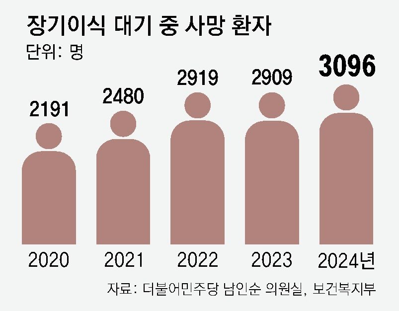 지난해 3000명 이상의 환자가 장기 기증을 기다리던 중 미처 이식받지 못한 채 사망한 것으로 나타났다. 장기이식을 기다리는 환자는 갈수록 늘고 있지만 기증 제도와 인식이 뒤따르지 못하면서 기증자는 줄어들고 있기 때문이다. 10일 더불어민주당 남인순 의원이 보건복지부로부터 제출받은 자료에 따르면 지난해 장기이식 대기 중 사망한 환자는 3096명이었다. 2020년(2191명)에 비해 41.3% 늘어난 수치다. 2015년 관련 통계를 집계한 이후 사망자 수가 가장 많았다. 장기이식을 기다리는 환자 수는 같은 기간 3만5852명에서 4만5567명으로 약 27% 늘었고, 올해는 6월까지 4만6416명으로 증가했다. 하지만 장기이식을 받은 환자는 2020년 5883명에서 지난해 5030명으로 오히려 15%가량 줄었다. 올 상반기(1∼6월)에는 2396명으로 더욱 줄어드는 추세다. 장기 기증의 대상이 될 수 있는 뇌사 추정자 신고 수는 늘고 있지만 가족의 기증동의율이 하락한 데 따른 것이란 분석이 나온다. 현재 국회엔 환자 본인의 사전 동의에 따라 심정지 환자의 장기 기증을 가능하도록 하는 ‘순환정지 후 기증’(DCD) 법안이 발의돼 있다. 하지만 여전히 상임위원회 문턱을 넘지 못하고 있는 상황이다. 남 의원은 “DCD 도입이 필요하다”며 “신속한 기증과 이식 진행을 위해 관계기관 전문 의료인이 기증자의 의무기록 사본을 발급받을 수 있게 제도도 개선해야 한다”고 말했다.김자현 기자 zion37@donga.com}