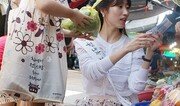 25일 롯데백화점 대구점이 마련한 중구 태평로 번개시장 체험행사에서 어린이가 전통시장상품권으로 구입한 채소를 장바구니에 담고 있다. 롯데백화점 대구점 제공}