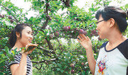 17일 경북 경산시 와촌면 강학리 한 과수원에서 여성들이 수확을 앞둔 자두를 만져보고 있다. 경산시 제공}