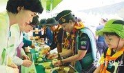 “한국 전통문화와 자연 경관에 반했어요.” 1일 경북 상주시 중동면 낙동강변 강창나루공원. 이곳에서 개막한 청소년 야영축제인 ‘국제패트롤잼버리’에서 이집트 출신 오마르 모함마드 하심 군(16)은 흥분을 감추지 못했다. 16시간 동안 비행기를 타고 오는 내내 가슴이 콩콩 뛰었다는 그는 “인터넷으로만 만났던 한국을 직접 방문해 정말 기쁘다”고 말했다. 그는 “축제 기간 다양한 체험을 통해 한국을 많이 배우고 돌아갈 것”이라고 덧붙였다. 6일까지 열리는 국제패트롤잼버리가 각국 문화를 체험하는 독특한 프로그램으로 호응을 얻고 있다. ‘즐거운 놀이’와 ‘유쾌한 잔치’라는 인디언 말에서 유래한 잼버리는 스카우트 활동의 꽃으로 불린다. 이번 행사는 한국스카우트연맹과 경북도, 상주시가 주최하고 여성가족부가 후원한다. 지구촌 청소년 문화 축제로 성장하고 있으며 국내 개최는 4회째다. 2일 야영장에서는 잼버리박람회가 열렸다. 부스 30여 곳에는 미국 영국 일본 싱가포르 나이지리아 인도 이집트 홍콩 등 45개 회원국의 문화 행사뿐 아니라 세계스카우트연맹이 제작한 기념품 판매장과 작품 전시회가 마련됐다. 경북도와 상주시 홍보관에서는 경북의 역사와 전통, 유적지를 소개해 관심을 모았다. 전통 차(茶) 체험공간은 특히 인기가 높았다. 베트남 스카우트연맹 운영위원인 파라하나 라만 씨(32·여)는 “차의 깊은 맛이 놀라웠고, 천천히 우려내는 과정도 흥미로웠다. 청소년 대원들이 차 예절을 배우면서 마음을 다스리게 돼 좋았다”고 말했다. 경북도립국악단의 무용과 북의 향연, 한복 패션쇼도 좋은 반응을 얻고 있다. 태권도 시범 행사에는 각국 청소년들의 함성이 넘쳤다. 상주 안동 경주 고령 등의 관광지를 둘러보는 야외 체험 활동에도 대원들이 몰렸다. 제주에서 온 조혜림 양(13)은 “책에서만 봤던 문화유적을 체험하는 소중한 기회였다. 다른 나라 친구들을 사귄 것은 평생 잊지 못할 추억”이라고 말했다. 청소년 8000여 명(외국인 700여 명)은 취사와 빨래를 손수 하면서 야영을 하고 있다. 강창나루공원 21만6000m²에는 텐트 2000여 동이 빼곡하게 들어서 작은 마을을 떠올리게 한다. 대원들은 패트롤(6∼8명으로 구성한 반) 방식으로 인디언 생존캠프와 승마체험, 재난안전교육, 친환경에너지 체험, 낙동강 트레킹, 바람직한 먹을거리 만들기 등 30여 가지 프로그램을 통해 리더십과 문제해결 능력을 기른다. 3개 이상 체험 활동에 성공하면 스카우트 상징물(배지)을 받게 된다. 경북 대원인 김희성 군(19)은 “외국인 친구와 같이 밥도 해먹고 재미있는 놀이를 하면서 문제를 해결하니까 힘들지 않다”고 말했다. 한국스카우트연맹은 이번 잼버리가 청소년들의 모험심을 기르고 성취감을 얻는 성장의 자리가 되도록 하고 세계 문화를 배우는 교육 현장이 되도록 할 계획이다. 함종한 총재는 “세계 문화 교류의 장은 국내 잼버리의 새로운 시도”라며 “지구촌 청소년과 우정을 나누고 많은 경험과 지식을 얻어 훌륭한 리더로 자라는 계기가 됐으면 한다”고 말했다.장영훈 기자 jang@donga.com}