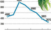 한때 포기당 1만 원을 넘어섰던 배추 가격이 빠르게 내려가고 있다. 일부 대형마트에서는 포기당 2000원대에 판매하고 있으며, 정부가 집계하는 배추 소매가격도 3000원대까지 하락했다. 21일 농협유통 하나로클럽 양재점에 따르면 배추 한 포기 가격이 지난주보다 39%(1500원) 내린 2300원에 거래됐다. 롯데마트 역시 22일부터 국산 배추 한 포기를 2670원에 판매한다. 하나로클럽 측은 “경기, 충청권 등 산지에서 출하량이 늘어 가격이 내려갔다”며 “배추 가격이 안정을 찾으면서 무, 대파도 가격이 내려가고 있다”고 설명했다. 농림수산식품부가 발표한 이날 배추 소매가격도 전날보다 496원 내린 3860원을 기록했다. 소매가격이 3000원대에 진입한 것은 8월 말 이후 처음이다. 다만 이날 서울 송파구 가락동 농수산물도매시장의 도매가격은 반입량이 일시적으로 줄면서 전날보다 71원 오른 2994원으로 집계됐다. 농식품부 관계자는 “출하지역이 경기 북부부터 시작해 남부 지역으로 내려가고 있고, 작황이 좋아 출하량도 증가하고 있다”며 “앞으로 배추 가격은 계속해서 더 떨어질 것으로 예상하고 있다”고 말했다.한상준 기자 alwaysj@donga.com조이영 기자 lycho@donga.com}