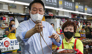 윤석열 대통령이 31일 ‘제27회 바다의날’ 기념식에 참석하기 위해 취임 후 처음으로 부산을 찾았다. 윤 대통령은 21년 전 부산지검에서 근무하던 당시 자주 방문한 횟집 등을 언급하며 부산과의 인연을 강조했다. 또 수산시장에서 만난 상인들과 주먹인사를 나누고 사진 촬영에도 응했다. 윤 대통령은 이날 낮 12시경 부산 자갈치시장에 도착했다. 넥타이를 매지 않은 와이셔츠 차림의 윤 대통령은 시민들의 환호에 주먹을 들어보이며 화답했다. 횟감을 구매하기 위해 한 점포를 방문한 윤 대통령은 뜰채로 광어를 직접 들었다가 떨어뜨리기도 했다. 이후 상인이 건넨 비닐봉지에 광어를 담았다. 횟감은 부산지역 상품권으로 계산했다.뒤이어 방문한 점포에서 윤 대통령은 “여기는 제가 학생 때부터 많이 들렀던 곳”이라고 했다. 상인이 즉석에게 전복회를 썰어주자 그는 “한 점만 한 점…”이라며 전복회 2점을 먹고 물을 마셨다. 가게 주인의 사인 요청에는 ‘자갈치 신광 상회 번창하세요 2022. 5. 31. 대통령 윤석열’라고 적었다. 다른 가게로 이동 중에도 윤 대통령은 시민·상인과 악수하거나 주먹 인사를 나눴다.한 상인이 해삼과 낙지를 가져오자 윤 대통령은 두 손으로 낙지를 쥐었다가 다시 한 손으로 낙지를 잡아 올리기도 했다. 윤 대통령은 시장을 나서기 전 수행 참모에게 “계산한 건가”라고 물으며 포장한 수산물을 계산하도록 지시했다. 이동하는 윤 대통령에게 “와이래 살이 많이 빠졌습니까”라고 묻는 시민도 있었다.윤 대통령은 이어 오찬 장소인 횟집으로 이동했다. 점심 메뉴로는 광어 회덮밥과 도밋국, 반찬으로는 전복과 멍게회 한 접시에 해초무침 등이 제공됐다. 2001년 8월부터 이듬해 1월까지 부산지검에서 일했던 윤 대통령은 “(유명 횟집이) 광안리 관사 바로 옆이라 퇴근길에 많이 다녔다”면서 “아주 값도 쌌는데 거기는 없어진 모양”이라고 추억을 꺼냈다. 또 “점심 먹으러 자주가는 통영집이라고, 멍게 비빔밥 집이 지금도 생각난다”고도 했다. 동석한 김재석 부산어패류처리조합장은 “시장 관리비가 높은데 사용료까지 내야 하면 어렵다”고 하소연했다. 윤 대통령은 이에 “저도 신경 쓸 테니까 부산 시장 출마하신 분한테 각서 받으시라, 시장 나오신 분들한테…”라며 농담했다. 김 조합장이 재차 “(윤 대통령에게) 문자 많이 했다”고 말하자 윤 대통령은 “문자가 하루에 1000~2000개씩 오니까 볼 수가 없다”며 “명함 가지고 서울 올라가서 전화드리겠다”고 했다. 조혜선 동아닷컴 기자 hs87cho@donga.com}