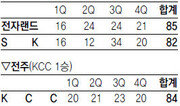 “주성이만 있었어도 뭔가 노릴 만했는데….” 동부 강동희 감독은 시즌 개막 후 2연승했지만 오히려 아쉬움을 드러냈다. 간판스타 김주성(205cm)이 11월 광저우 아시아경기 대표 차출로 뛸 수 없게 됐기 때문이다. 김주성은 평균 16.5득점, 5.5리바운드, 2.5어시스트에 수비에서도 눈부신 활약으로 동부의 연승을 이끌었다. 그의 빈자리는 역시 컸다. 19일 인천에서 김주성 없이 처음 전자랜드와 경기를 치른 동부는 골밑 열세 속에서도 막판까지 버텼으나 끝내 시즌 첫 패배를 안았다. 우승 후보로 꼽히는 전자랜드는 79-73으로 역전승을 거둬 2승 1패로 동부와 동률을 이뤘다. 동부는 김주성을 대신해 3월 제대 후 복귀한 김봉수(200cm)를 투입하며 전반을 37-32로 앞섰다. 하지만 3쿼터 초반 김봉수가 4반칙에 걸린 데다 전자랜드의 높이에 막혀 역전을 허용했다. 전자랜드는 후반 초반 내리 7점을 뽑으며 전세를 뒤집은 뒤 3쿼터를 55-50으로 마쳤다. 평소에도 땀을 많이 흘리던 강 감독은 수건으로 연방 이마를 닦으며 한숨을 내쉬었다. 동부는 4쿼터 한때 외곽슛을 앞세워 69-69로 동점을 이루기도 했으나 올 시즌 데뷔한 혼혈선수 문태종의 공격까지 폭발한 전자랜드에 더는 추격의 힘을 잃었다. 문태종은 흰색 헤어밴드에 ‘팬 여러분 사랑합니다’라는 문구와 태극기를 새기고 출전해 28점을 터뜨렸다. 특히 1점 차로 쫓긴 종료 5.8초 전 절묘한 중거리슛을 꽂아 승리를 결정지은 것을 포함해 4쿼터에만 17점을 퍼부었다. 문태종은 “이제 3경기 했을 뿐이다. 동료들과 호흡을 맞추기 시작하면서 점점 나아질 것”이라고 말했다. 부산에서 KT는 박상오(18득점)를 비롯해 4명이 10점 이상을 넣으며 한국인삼공사를 82-73으로 꺾고 역시 2승 1패를 기록했다. 지난해부터 홈 9연승. KT는 지난 시즌 인삼공사에 6전전승을 거둔 데 이어 상대 전적 7연승의 우세를 지켰다. KT&G에서 둥지를 바꾼 인삼공사는 시즌 첫 승에 실패하며 3연패에 빠졌다.김종석 기자 kjs0123@donga.com ▼우승후보 신세계 “첫승 힘드네”▼kdb생명에 져 개막 3연패신세계 정인교 감독은 시즌 개막 전 “신한은행 임달식 감독이 느꼈을 부담감을 이제 알겠다. 하지만 즐거운 부담감”이라고 말했다. 시즌 전 대어급 선수들을 보강한 뒤 팀이 우승 후보로 급부상하자 지난 4년간 여자농구 최강자였던 신한은행의 임 감독에 빗대 얘기한 것이다. 하지만 정 감독은 아직 그 부담감을 즐기지는 못할 것 같다. 아직 시즌 첫 승도 신고하지 못해서다. 신세계는 19일 구리체육관에서 열린 kdb생명과의 방문경기에서 66-69로 져 개막 뒤 3연패에 빠졌다. 반면 김영주 감독 체제로 새 출발한 kdb생명은 2패 뒤 시즌 첫 승을 올렸다. 주장 신정자가 13득점, 12리바운드로 활약하며 김 감독에게 사령탑 데뷔 첫 승을 안겼다. 가드 이경은(19득점, 7어시스트)은 종료 54초를 남기고 63-63 동점이 된 후 자유투로만 6점을 넣으며 접전에 마침표를 찍었다.김성규 기자 kimsk@donga.com}