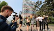 “색깔은 어떻게 골랐나요?” “컬러 옷을 입은 건물에서 일하면 어떤 기분이 들죠?” 24일 오후 서울 종로구 광화문 동아미디어센터 건물 1층 로비. 외국인 6명이 대형 TV 화면에 눈을 고정시킨 채 질문을 쏟아냈다. 화면에는 프랑스 현대미술가 다니엘 뷔렌(81)의 ‘한국의 색’ 옷을 입은 동아미디어센터가 나오고 있었다. “노랑 보라 오렌지 등 8가지 색을 5층부터 20층까지 창문 안쪽에 부착했어요.” “요즘 직원들은 ‘너희 층은 무슨 색이냐’고 인사를 주고받습니다.” 김선미 동아일보 뉴센테니얼본부 크리에이티브랩팀장의 설명에 “대박” “정말 예뻐요”라며 다함께 웃음을 터뜨렸다. 이들은 러시아 음악전문채널 ‘MTV 러시아’에서 3∼6월 방영하는 ‘케이팝 엠티캠프(K-POP MTCamp)’의 최종 우승자들. 노래 춤 요리 디자인 등 한국 관련 경연을 통해 진정한 ‘한류 팬’을 뽑는 리얼리티 쇼다. 최초 지원자 3000여 명 가운데 예선을 거친 25명이 프로그램에 참여했다. 끝까지 살아남은 5명(1명은 멘토)이 포상 휴가 격으로 23∼29일 한국을 여행하고 있다. 방송팀 인솔자인 하르첸코 옐레나 한국관광공사 모스크바지사 매니저는 “역사 테마와 케이팝 테마로 일정을 짜던 중 뷔렌의 ‘한국의 색-인 시튀’ 작업에 대한 이야기를 들었다”며 “직접 와 보니 역사 유적과 현대 미술이 조화를 이룬 분위기가 인상적”이라고 했다. 한국 여행 편은 현지에서 6월에 방영한다. 이들은 뷔렌의 작품 설명을 들은 뒤 도보로 2분 거리인 서울파이낸스센터 앞 작은 광장으로 이동했다. 이른바 ‘포토 존’에서 건물 전체를 담은 사진을 찍기 위해서다. 우승자들은 “서울의 중심에 이렇게 멋진 공공작품이 있다니 놀랍다”며 건물을 바라보다가 걸그룹 ‘에이핑크’의 춤을 추며 끼를 발산했다. 우승자들은 27일 부산을 거쳐 28일 광주에서 ‘2019 광주세계수영선수권대회 성공기원 SBS 슈퍼콘서트’를 관람한다. 이들을 포함해 한국관광공사가 모집한 한류 팬 1만 명이 콘서트 무대에 오르는 방탄소년단(BTS) 트와이스 등 케이팝 스타를 만난다. 관광공사 관계자는 “최근 한류가 제2의 전성기를 맞으면서 일본 호주 미국 폴란드 등 한국을 찾는 해외 방송사가 늘고 있다”며 ”광화문의 랜드마크로 자리 잡은 뷔렌의 작품을 담고 싶다는 문의가 활발하다”고 했다. 이설 기자 snow@donga.com}