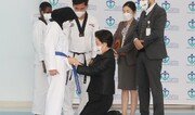 문재인 대통령과 함께 아랍에미리트(UAE)를 순방 중인 김정숙 여사가 17일 오후(현지시간) 샤르자 인도주의 복지센터를 방문해 청각 장애 학생들의 태권도 수업을 참관했다. 이곳에서 김 여사는 전 UAE 국가대표팀 코치이자 샤르자 왕국 경호부장 출신 박형문 사범이 청각 장애를 가진 20여 명의 학생들에게 태권도를 가르치는 장면을 직관했다. 김 여사는 2019년 10월 전국장애인체육대회 개회식에서 “틀리지 않습니다. 우리는 다릅니다. 못하는 게 아닙니다. 자신만의 방식대로 하는 것입니다”라고 수어로 선수들을 응원한 바 있다. 김정숙 여사는 해외 순방 때마다 빠지지 않고 장애인들을 만나왔다. 김정숙 여사가 강당으로 들어서자 하얀색 태권도복을 입은 어린이들은 태권도의 나라에서 온 영부인을 손을 들어 환영했다. 흰띠, 노란띠, 파란띠, 빨간띠 등 아이들이 허리에 맨 띠 색깔은 각기 달랐지만 도복 왼쪽 가슴에는 모두 태극기와 UAE국기가 나란히 붙어 있었다. 아랍 수어와 한국 수어로 인사를 건넨 김 여사는 데플림픽(국제 농아인 올림픽대회) 경기장에서 ‘반짝이는 박수 소리를 보고 싶다’는 친구들에게 “길이 없으면 길을 만들어서 가자”고 응원하며 평창 동계올림픽 공식응원 구호인 “아리아리”를 한국 수어로 전했다.아이들을 가르치고 있는 박형문 사범은 “코로나에도 일주일에 2~3회는 꾸준히 수업을 하고 있다”며 “전 선수가 검은띠를 취득하고 데플림픽에 나가는 것이 우리 아이들의 목표”라고 소개했다. 김 여사는 승급을 앞둔 학생들을 위해 준비한 파란띠 선물을 무릎을 꿇고 직접 매줬다. 노란색 자수로 각자의 이름이 새겨진 띠를 선물로 받은 아이들은 눈빛을 반짝이며 소리 없는 기쁨을 표시했다.김 여사는 “수어로 인사를 전하려고 많이 연습했는데 태권도를 집중해서 보느라 다 잊어버렸다”며 “너희들이 자랑스럽다. 사랑한다”는 수어 인사를 전했다.양회성 기자 yohan@donga.com}