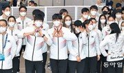 컬링 김경애(앞줄 오른쪽)를 비롯한 2022 베이징 겨울올림픽 한국 대표팀 본진이 21일 인천국제공항을 통해 귀국한 뒤 취재진을 향해 인사를 하고 있다. 스피드스케이팅 대표 정재원(앞줄 왼쪽에서 두 번째), 김민석(앞줄 왼쪽에서 세 번째)은 이번 대회에서 자신이 따낸 메달을 들고 포즈를 취했다. 쇼트트랙 대표팀 등은 이에 앞서 18일 이미 귀국한 상태다.인천=양회성 기자 yohan@donga.com}