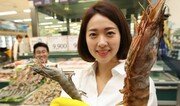 1일 서울 용산구 이마트 용산점에서 모델들이 ‘킹블랙타이거 새우’를 선보이고 있다. 이 새우의 크기는 20∼40cm로 흰다리새우의 최대 20배에 이른다. 이마트는 8일까지 킹블랙타이거 새우를 100g당 4980원에 판매한다. 김동주 기자 zoo@donga.com}