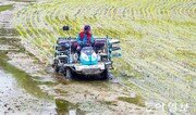 21일 경북 안동시 와룡면 감애리 논에서 농민이 기계로 모내기를 하고 있다. 안동시 제공}