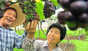 26일 경북 경산시 남산면 비닐하우스에서 농민 부부가 익어가는 거봉포도를 살피고 있다. 다음 달 초부터 수확할 예정이다. 경산시 제공}