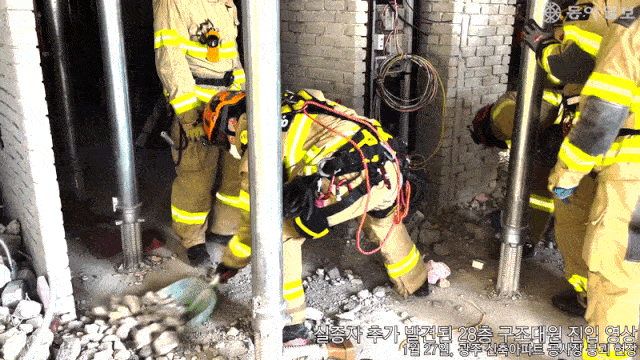 광주 서구 화정아이파크 붕괴 현장에서 매몰자가 추가로 발견됐다. 중앙사고수습본부는 27일 오전 11시 50분경 화정아이파크 201동 28층에서 콘크리트 잔해물을 제거하던 중 매몰자 1명을 발견했다. 중수본은 이날 발견된 매몰자 신원을 A 씨, 전날 27층에서 발견된 매몰자 신원은 B 씨로 확인했다. A 씨는 오른쪽 두 번째 손가락 지문으로, B 씨는 돌에 묻은 혈흔을 채취해 유전자(DNA) 검사로 신원을 확인했다고 한다. 이번 붕괴 사고로 근로자 1명이 사망했고, 2명이 매몰된 상태로 발견돼 구조 중이지만 나머지 3명은 여전히 실종 상태다. 중수본은 유압 콘크리트 절단기를 비롯해 다양한 장비를 동원해 벽을 뚫은 후 잔해물을 치우며 구조작업을 진행하고 있다. 그러나 27, 28층에는 잔해물이 겹겹이 쌓여 있어 매몰자를 구조하기까지 상당한 시간이 걸릴 것으로 보인다. 이날 현장 관계자에 따르면 201동 옆 동인 203동 39층에서 일부 슬래브(콘크리트를 부어 만든 판 형태의 구조물) 처짐 등이 발견되기도 했다. 현장 관계자는 “처짐 정도가 심하지 않고 갈라짐도 없어 붕괴 위험이 있다고 보기는 어렵다”면서도 “39층에 설치된 데크플레이트(특수거푸집) 하중이 제대로 분산되지 않고 있을 가능성이 있어 정밀 계측 뒤 보강 대책을 마련할 예정”이라고 전했다. 한편 현대산업개발 관계자들은 이날 경찰 조사에서 “협력업체가 임의대로 38층 지지대를 제거했다”고 진술한 것으로 알려졌다. “현대산업개발의 지시로 지지대를 철거했다”는 협력업체 관계자의 진술을 부인한 것. 감리회사 관계자들도 경찰 조사에서 “38층 지지대가 설치되지 않았다는 걸 몰랐다”고 말한 것으로 전해졌다.광주=이형주 기자 peneye09@donga.com이새샘 기자 iamsam@donga.com}