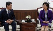 김연철 통일부 장관(왼쪽)이 14일 서울 종로구 정부서울청사에서 17일 미국을 방문하는 현정은 현대그룹 회장과 면담하고 있다. 김 장관은 “현대와 정부가 긴밀하게 소통하면서 해법을 찾아야 되지 않을까 싶다”고 말했다. 전날 통일부 고위 당국자는 대북 신규 투자 등을 금지한 5·24조치에 대해 “유연하게 얼마든지 대응할 수 있다”며 금강산 신규 투자 허용 가능성을 내비친 바 있다. 홍진환 기자 jean@donga.com}