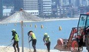 23일 부산 수영구 직원들이 광안리해수욕장 개장에 대비해 안전부표설치와 모래 준설을 마치고 청소를 하고 있다. 박경모 기자 momo@donga.com}