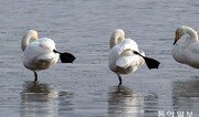 물가, 겨울 가객들의 몸동작이 심상치 않네요. 태권도 옆차기인지, 발레 점프인지…. 옆에 무서운 교관도 있군요. “고니 체면이 있으니 최대한 우아하게!” ―충남 서산시 천수만에서 박영대 기자 sannae@donga.com}