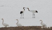 두루미 두 마리의 애정 행각이 얼음밭을 녹일 것처럼 뜨겁습니다. 무심하게 지나가고 있는 큰고니들은 무슨 생각을 하고 있을까요. 옆구리가 유난히 시린 이 겨울, 영물(靈物)이라 불리는 두루미도 외로움 앞에선 어쩔 수 없는 존재인가 봅니다. 철원=박영대 기자 sannae@donga.com}