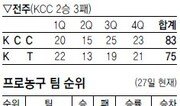 KCC는 올 시즌 KT에 약한 모습을 보였다. 네 차례의 맞대결에서 최근 2연패를 비롯해 1승 3패로 열세였다. KCC 허재 감독이 용산고 2년 선배인 KT 전창진 감독의 노련한 전술에 번번이 막혔다는 지적도 나왔다. 그런 KCC가 27일 안방 전주실내체육관에서 열린 KT와의 시즌 5차전에서 부상으로 출전 여부가 불투명했던 하승진(221cm)까지 기용하는 총력전을 펼친 끝에 83-75로 이겼다. 홈경기 8연승을 질주한 KCC는 29승 12패를 기록해 KT를 91일 만에 3위로 밀어내고 2위로 올라섰다. 선두 모비스와 KCC는 1경기 차. 23일 KT&G와의 경기에서 왼쪽 종아리를 다친 하승진은 훈련도 없이 출전 의지를 밝힌 끝에 코트에 나서 20분 30초를 뛰며 16득점, 10리바운드로 골밑을 지켰다. KCC 아이반 존슨은 31득점, 21리바운드로 맹활약하며 무득점에 그친 테렌스 레더의 부진까지 메웠다. KCC 맏형 추승균(21득점)은 승부가 갈린 후반에만 14점을 집중시키며 해결사로 나섰다. 제스퍼 존슨이 27점을 넣은 KT는 4쿼터에 3점슛 10개를 시도했지만 2개만을 적중시키는 난조에 허덕였다. KT 나이젤 딕슨은 2득점. 전반을 35-35로 팽팽히 맞선 KCC는 3쿼터에 추승균과 존슨을 앞세워 25점을 집중시키며 KT를 19점으로 묶어 앞서기 시작했다. KCC는 4쿼터 막판 수비 리바운드를 따낸 추승균의 긴 패스를 받은 존슨이 종료 55초 전 덩크슛으로 80-73을 만들며 승리를 결정지었다.김종석 기자 kjs0123@donga.com}