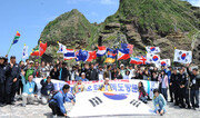 “6·25전쟁 참전국에서 온 학생들에게 대한민국 영토의 상징인 독도를 보여줄 수 있어 기쁩니다.” 30일 부산민족학교 독도학당 이사장 김희로 씨(77)는 독도가 손에 잡힐 듯 가까워지자 감격스러워하며 이렇게 말했다. 이날 독도에는 6·25전쟁 참전 16개국의 국기가 태극기와 함께 펄럭였다. 6·25전쟁 60주년을 맞아 부경대와 부산민족학교, 독도학당이 공동 주관한 ‘6·25 60주년 기념 참전국 유학생 독도방문’ 행사에 부산 부경대에서 유학 중인 미국 영국 인도 터키 등 참전 7개국 학생 20명과 한국 대학생 등 80여 명이 참가했다. 이들은 30일 오전 독도를 향해 출발한 울릉군청 행정선에 몸을 실었다. 이들이 독도에 도착하자 김희로 씨의 시 ‘내 사랑 독도’가 울려 퍼졌고 독도를 지키려다 희생된 영령을 달래는 허경미 씨(38)의 살풀이 춤 ‘독도여, 영원하라’가 공연됐다. 유학생들은 독도 경비대원들과 사진을 찍으며 “독도, 파이팅”을 외쳤다. 독도 경비대 길성용 부대장(30)은 “이번 기회에 독도가 외국인들에게 더 많이 알려지면 좋겠다”고 말했다. 30분간의 짧은 방문을 마친 터키 출신 유학생 엠므라 씨(24)는 “독도가 형제의 나라인 한국 영토라는 사실을 고국에 알리고 싶다”고 말했다.독도=장관석 기자 jks@donga.com}