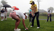 10일 강원 정선군 하이원CC에서는 뜻 깊은 이벤트가 열렸다. 정상급 여성 프로골퍼 4명이 시각장애인 골퍼들을 위한 레슨 행사를 마련한 것. 미국여자프로골프(LPGA)와 한국여자프로골프(KLPGA)에서 활약하고 있는 정일미, 이보미, 홍란, 배경은 선수는 시각장애인 골퍼 임동식 씨(52)와 양정옥 씨(40·여) 등 2명에게 스윙에서부터 퍼팅에 이르기까지 각종 자세에 관한 원포인트 레슨을 실시했다. 안마업에 종사하고 있는 임 씨와 양 씨는 취미 생활로 골프를 즐기는 아마추어들. 임 씨는 “유명 선수들로부터 레슨을 받아 많이 떨렸지만 보통 때보다 샷이 안정되는 느낌을 받았다”며 “국내에 50여 명의 시각장애인 골퍼가 있는데 앞으로 이런 기회가 더 많이 주어졌으면 좋겠다”고 말했다. 이들을 지도한 프로골퍼들은 눈을 안대로 가리고 샷을 하며 시각장애인 체험을 하기도 했다. 배 선수는 어드레스 시 클럽이 열려 슬라이스가 나는 등 쉽지 않은 체험에 머리를 갸우뚱거렸다. 정 선수는 “짧은 시간이었지만 이들과 함께한 골프 체험은 감동적인 경험이었다”며 “이번 행사가 골프에 관심 있는 장애우들에게 희망을 주는 계기가 되기를 바란다”고 말했다. 정선=이인모 기자 imlee@donga.com}