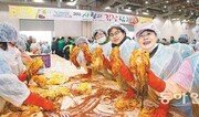 19일 경북 구미시 산동면 구미코에서 열린 ‘사랑의 김장 담그기’ 행사에서 자원봉사자들이 양념을 버무린 배추를 보여주고 있다. 이 행사는 다음 달 13일까지 이어지며 김치 10만 포기를 지역의 불우이웃 2만4000가구에 전달할 예정이다. 경북도 제공}