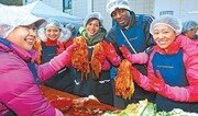 21일 대구 남구청 광장에서 열린 사랑의 김장 나누기 행사에서 자원봉사자와 결혼이주여성, 미군이 양념을 버무린 김장용 배추를 보여주고 있다. 남구는 불우이웃 600가구에 김장을 전달할 예정이다. 대구 남구 제공}