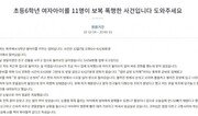 초등학생 6학년인 딸이 중학생 11명에게 보복 폭행당했다며 도움을 요청하는 엄마의 사연이 공개됐다.지난 14일 청와대 국민청원 게시판에는 ‘초등 6학년 여자아이를 11명이 보복 폭행한 사건입니다. 도와주세요’라는 제목의 청원이 게재됐다. 해당 청원은 사전동의 기준 100명을 넘겨 관리자가 공개를 검토 중이다.초교 6학년 딸 B 양을 키우고 있는 엄마라고 밝힌 A 씨는 “퇴근 후 집에 도착해 저녁 준비를 하던 중 아이가 방에서 나오지 않아 들어가 보니 옷이 피범벅 상태였다”며 “옷에 피가 왜 묻었냐고 묻자 친구들과 다퉜는데 코피가 묻었다고 했다”고 전했다.그러나 이상한 기운을 감지한 A 씨는 B 양에게 마스크를 내려보라고 했다. B 양의 얼굴엔 상처가 가득했다. A 씨는 “딸의 코와 입엔 피가 잔뜩 묻어 있었고, 코는 많이 부어 있었다”며 “눈물을 뚝뚝 흘리는 아이에게 물었더니 집으로 오는 길에 언니, 오빠가 때렸다고 했다”고 말했다.A 씨에 따르면 B 양이 폭행당한 것은 처음이 아니었다. 지난 6월 23일, B 양은 지나가던 남학생 두 명이 공유 킥보드를 타는 것을 보고 친구에게 “저거 타면 안되는 건데 미쳤네. 미친 X들이네”라고 말했다고 한다.이를 들은 남학생들은 B 양을 아파트 놀이터로 데려가 무릎을 꿇린 채 머리를 때리며 사과를 종용했고, B 양이 사과하자 그를 집으로 돌려보냈다.A 씨는 당시 B 양에게 “왜 오빠들에게 욕을 하니”라며 “다시는 그러지 말고 다른 길로 돌아 집에 와라”고 말했다고 한다.사건으로부터 약 6개월이 흐른 지난 12월 7일, 귀가하던 B 양을 남학생들이 놀이터로 데려갔다. 그곳엔 세 명의 여학생과 여덟 명의 남학생이 모여있었다. 이들은 “얘가 맞아?” “맞다” 등 대화를 나눴고, B 양은 ‘그때 그 일로 잡았구나’라고 생각했다고 한다.이들은 B 양의 옷을 벗기려 했고, 담배 연기를 얼굴에 뿜거나 담배를 입에 갖다 대며 흡연을 강요했다. 옷에 침을 뱉고 머리를 잡아당기기도 했다. 또 B 양을 붙잡은 채 얼굴을 주먹으로 때리고, B 양이 쓰러지자 머리를 발로 차며 “일어나라”고 했다.피가 많이 난 B 양은 울며 엄마에게 가고 싶다고 말했지만, 이들은 물티슈를 사와 B 양에게 묻은 피를 닦았다. 그런데도 피가 멈추지 않자 화장실에 가 얼굴을 씻고 와야 보내준다고 말했다. B 양은 상가 화장실까지 걸어가 얼굴을 씻고 나왔다고 한다.A 씨는 “피 흘리며 걸어갔을 상가 화장실 가는 곳곳에 뿌려져 있던 아이 핏자국에 가슴이 녹아내렸다”며 “말라버린 피 묻은 마스크와 맞았던 자리의 핏자국을 보며 어떻게 이게 중학생 1학년 아이들의 행동일 수 있을까 억장이 무너져 내린다”고 토로했다.그러면서 “가해 학생 남학생 두 명만 인정했고 여학생들은 ‘걱정돼서 피를 닦아 준 거다’라고 주장한다”며 “촉법소년인 걸 알고 이렇게까지 잔혹하게 집단폭행을 가한 아이들이 벌을 받지 않는다면 또다시 피해 학생들이 나타날 것이다. 이런 극악무도한 폭행이 우리 아이에게서 끝날 수 있도록 도와달라”고 호소했다.이와 관련해 파주경찰서 측은 자세한 사건 경위 등을 파악하기 위해 해당 사건을 수사 중이라고 15일 밝혔다. 김혜린 동아닷컴 기자 sinnala8@donga.com}