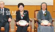 유한재단(이사장 정원식)은 19일 서울 동작구 대방동 유한양행 대회의실에서 제21회 유재라봉사상 시상식을 가졌다. 이 상은 유한양행 창업자인 고 유일한 박사의 장녀 유재라 여사의 사회공헌 정신을 기리기 위해 1992년 제정했다. 왼쪽부터 윤서영 교사(강원 마차초등학교·교육부문)와 김길윤 씨(대한적십자사 대구지사·복지부문), 정 이사장, 송미옥 씨(계명대 동산병원 암센터 운영지원팀장·복지부문), 김혜자 수녀(한국가톨릭레드리본·간호부문). 유한재단 제공}