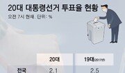제20대 대통령선거 본투표일인 9일 오전 7시 기준 전국 투표율은 2.1%로 나타났다. 19대 대선(2017년)의 같은 시간대 투표율 2.5%보다 0.4%포인트 낮은 수준이다.중앙선거관리위원회에 따르면 이날 오전 6시부터 진행한 투표에서 전국 유권자 4419만7692명 중 94만2061명이 투표를 마쳤다. 지난 4∼5일 실시된 사전투표분(투표율 36.93%)은 포함되지 않았고, 오후 1시부터 공개되는 투표율에 합산된다. 지역별로는 대구가 2.6%로 가장 높은 투표율을 차지했다. 이어 대전(2.5%) 인천, 울산, 제주(이하 2.3%), 경기, 충북, 경남(이하 2.2%) 순으로 투표율이 높았다. 가장 낮은 곳은 전남(1.4%)이다. 한편 투표는 이날 전국 1만4464개소에서 오후 7시 30분까지 진행된다. 일반 유권자는 오후 6시까지, 코로나19 확진·격리 유권자는 오후 6시부터 오후 7시 30분까지 투표할 수 있다. 조혜선 동아닷컴 기자 hs87cho@donga.com}