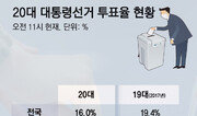 제20대 대통령선거 본투표일인 9일 오전 11시 기준 전국 투표율은 16%로 나타났다. 19대 대선(2017년)의 같은 시간대 투표율 19.4%보다 3.4%포인트 낮은 수준이다.중앙선거관리위원회에 따르면 이날 오전 6시부터 진행한 투표에서 전국 유권자 4419만7692명 중 708만1521명이 투표를 마쳤다. 지난 4∼5일 실시된 사전투표분(투표율 36.93%)은 포함되지 않았고, 오후 1시부터 공개되는 투표율에 합산된다.지역별로는 대구가 18.7%로 가장 높은 투표율을 차지했다. 이어 제주(17.3%), 경기·충남(각 16.9%), 경남(16.8%), 충북(16.7%) 순으로 투표율이 높았다. 서울은 전국 평균에 못 미치는 15%다. 또한 광주광역시(13%), 전남(13.3%)은 상대적으로 낮은 투표율을 보였다.다만 전남은 유권자의 절반 이상(사전투표율 51.45%)이 사전투표를 통해 한 표를 행사했다. 광주광역시도 과반에 육박하는 48.27%를 기록했었다. 사전투표 당시 상대적으로 투표율이 낮았던 대구(33.91%)와 경기(33.65%) 등의 유권자는 대선 당일인 본투표에 참여하는 것으로 보인다. 투표는 이날 전국 1만4464개소에서 오후 7시 30분까지 진행된다. 일반 유권자는 오후 6시까지, 코로나19 확진·격리 유권자는 오후 6시부터 오후 7시 30분까지 투표할 수 있다. 조혜선 동아닷컴 기자 hs87cho@donga.com}