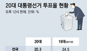 제20대 대통령선거 본투표일인 9일 낮 12시 기준 전국 투표율은 20.3%로 나타났다. 19대 대선(2017년)의 같은 시간대 투표율 24.5%보다 4.2%포인트 낮은 수준이다.중앙선거관리위원회에 따르면 이날 오전 6시부터 진행한 투표에서 전국 유권자 4419만7692명 중 896만2418명이 투표를 마쳤다. 지난 4∼5일 실시된 사전투표분(투표율 36.93%)은 포함되지 않았고, 오후 1시부터 공개되는 투표율에 합산된다.지역별로는 대구가 23.5%로 가장 높은 투표율을 차지했다. 이어 울산(21.4%), 경기·충북(각 21.3%) 충남(21.2%) 등의 순으로 투표율이 높았다. 서울은 전국 평균에 못 미치는 19.3%다. 전남(16.4%), 광주광역시(16.6%)는 상대적으로 낮은 투표율을 보였다.다만 전남은 유권자의 절반 이상(사전투표율 51.45%)이 사전투표를 통해 한 표를 행사했다. 광주광역시도 과반에 육박하는 48.27%를 기록했었다. 사전투표 당시 상대적으로 투표율이 낮았던 대구(33.91%)와 경기(33.65%) 등의 유권자는 대선 당일인 본투표에 참여하는 것으로 보인다. 투표는 이날 전국 1만4464개소에서 오후 7시 30분까지 진행된다. 일반 유권자는 오후 6시까지, 코로나19 확진·격리 유권자는 오후 6시부터 오후 7시 30분까지 투표할 수 있다. 조혜선 동아닷컴 기자 hs87cho@donga.com}