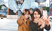 18일 대구백화점 프라자점 정문에 설치된 크리스마스 조형물을 배경으로 시민들이 사진을 찍고 있다. 대구백화점 제공}