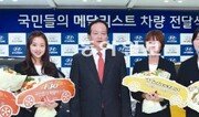 현대자동차는 20일 서울 종로구 계동 사옥에서 ‘국민들의 메달리스트’로 선정된 2012 런던 올림픽 국가대표 선수 5명에게 차량을 전달했다. 현대차는 최근 페이스북, 트위터 등 소셜네트워크서비스(SNS)를 통해 올림픽에서 메달을 따지 못한 선수 중에서 추천을 받았다. 왼쪽부터 김연경 선수(여자 배구)의 아버지 김동길 씨, 손연재 선수(리듬체조), 김충호 현대차 사장, 양수진(여자 근대5종), 장미란(여자 역도), 정진화 선수(남자 근대5종). 현대자동차 제공}
