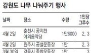 강원도는 ‘저탄소 녹색성장 원동력 조성 및 내 나무 갖기 캠페인’의 하나로 25일부터 다음 달 9일까지 무료로 나무 나눠주기 행사를 갖는다고 23일 밝혔다. 도는 2억1000만 원을 들여 구입한 꽃나무와 유실수, 조경수 등 11만여 그루의 묘목을 11개 시군에서 나눠줄 계획이다. 선착순으로 1인당 2, 3그루씩 받을 수 있다. 산림에 관한 일반 상식을 담은 홍보 리플릿도 함께 배포한다. 이인모 기자 imlee@donga.com}