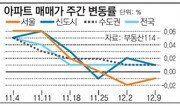 ‘11·3 부동산 대책’과 탄핵 정국 등의 영향으로 부동산 시장이 위축되며 서울 재건축에 이어 일반 아파트 값도 보합세로 돌아섰다. 11일 부동산114에 따르면 12월 첫째 주 서울 아파트 매매 시세는 이전 주보다 0.01% 하락하며 2주 연속 약세를 이어갔다. 재건축 아파트(―0.1%)뿐 아니라 일반아파트 매매가 상승세도 멈췄다. 지역별로는 양천(―0.18%) 강동(―0.17%) 송파(―0.08%) 중랑(―0.05%) 관악(―0.03%) 강남구(―0.01%) 순으로 매매가 하락폭이 컸다. 수도권 신도시 아파트 값 상승률은 0.01%로 전주(0.02%)에 비해 오름폭이 둔화됐다. 12월 첫째 주 서울 아파트 전세금은 0.03% 올라 전주(0.05%)보다 상승폭이 줄었다. 시장 전체의 위축세는 물론 겨울 비수기에 접어들면서 전세 수요가 줄어든 것도 영향을 미쳤다. 용산(0.26%) 서초(0.13%) 양천(0.13%) 구로구(0.11%)의 전세금은 올랐다. 하지만 강동(―0.19%) 서대문(―0.09%) 중랑(―0.08%) 관악(―0.07%) 송파구(―0.03%)는 하락했다.구가인 기자 comedy9@donga.com}