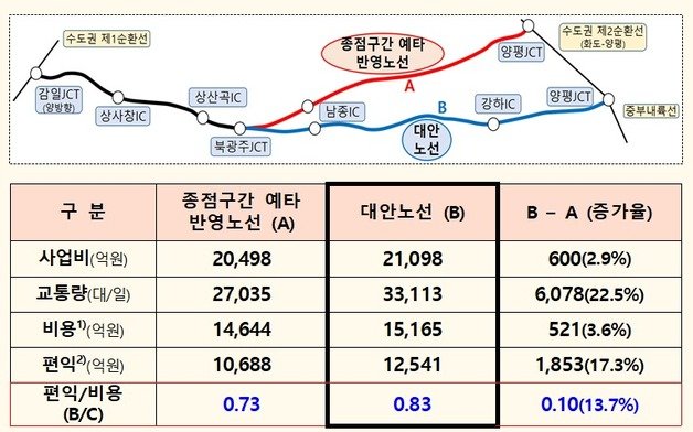김건희 여사 일가 특혜 의혹이 불거진 서울∼양평고속도로 노선과 관련해 정부가 경기 양평군 강상면 종점(대안 노선)이 양서면 종점(기존 노선)보다 더 낫다는 경제성 분석 결과를 발표했다. 국토교통부는 “전문가 검증을 하자”고 국회에 요청했지만 야당은 “기존 노선 경제성은 이미 입증됐다”고 주장해 갈등이 재점화될 수 있다는 관측이 나온다. 국토부는 5일 서울∼양평고속도로 사업의 기존 노선과 대안 노선의 비용·편익 분석(B/C) 결과 대안 노선의 B/C가 0.83으로 기존 노선(0.73)보다 13.7% 높았다고 밝혔다. B/C 분석은 사업비 대비 편익을 보여주는 지표로 숫자가 클수록 경제성이 좋다는 의미다. 대안 노선 사업비는 기존 노선(2조498억 원)보다 600억 원 늘어난 2조1098억 원으로 예상됐다. 반면 하루 평균 교통량은 기존 노선(2만7035대)보다 6078대 늘어난 3만3113대로 예측되며 사업비가 늘어도 교통량 증가량(편익)이 커지며 B/C도 높아진 것으로 나타났다. 이달 국감에서 서울∼양평고속도로가 쟁점이 될 것으로 예상되는 가운데 국토부는 이번 분석 결과를 제3의 전문가에게 검증받자고 국회에 요청할 계획이다. 대안 노선에 대한 객관성을 확보해 사업을 재개하려는 취지로 보인다. 하지만 더불어민주당은 기존 노선 경제성이 이미 입증됐다고 반박해 논란이 이어질 것으로 전망된다. 민주당 한준호 의원이 이날 한국도로공사에서 입수한 ‘국민행복 증진 및 미래성장을 위한 고속도로망 구축계획 수립(2021∼2030)’ 용역보고서에 따르면 기존 노선안의 사전타당성 조사 결과 B/C는 1.02로 대안 노선보다 높다. 이에 대해 국토부는 “기존 노선은 서울 직결 시 아파트 철거 등 6000억 원이 추가로 소요돼 실현 가능성이 낮다”고 했다.최동수 기자 firefly@donga.com}