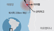 칠레 수도 산티아고 북서쪽 해상에서 강진이 일어나 최소 8명이 숨지고 일본 동남부 해안, 미국 캘리포니아 주와 하와이, 뉴질랜드, 피지 등에도 지진해일(쓰나미) 주의보가 내려졌다. 미국 지질조사국(USGS) 등은 해일이 18일 오전 한국 해상에도 영향을 미칠 것으로 예상했다. USGS는 16일 오후 7시 54분(현지 시간) 칠레 산티아고에서 북서쪽으로 228km 떨어진 해상에서 리히터 규모 8.3의 지진이 발생했다고 밝혔다. 진원의 깊이는 12km로 추정된다. 첫 지진 발생 뒤 리히터 규모 6.0, 7.0을 포함하는 여진이 15차례 이상 발생했다. 칠레 내무부는 17일 오전 현재 사망자를 8명으로 집계했으며 해안 저지대를 포함한 10개 도시에서 100만 명 이상이 지진해일에 대비해 대피했다고 밝혔다. 칠레 국립재난관리청(ONEMI)은 자국 남부 푸에르토아이센에서 북부 아리카까지 3900km에 이르는 해안가 저지대에 사는 주민들에게 긴급 대피령을 내렸다. 칠레 정부는 17일 모든 학교에 휴교령을 내렸다. 지진과 함께 칠레 해안 전역에 발령된 쓰나미 주의보는 17일 오전 해제됐다. 칠레에 한국 교민 2700명이 거주하고 있으나 17일 현재 사망자 등 피해는 없는 것으로 전해졌다. 이유종 기자 pen@donga.com}
