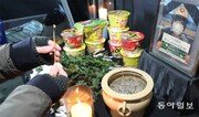충남 태안화력발전소에서 석탄을 나르는 컨베이어벨트를 점검하던 중 목숨을 잃은 고 김용균 씨의 분향소에서 추모객이 향을 피우고 있다. 서울 광화문광장에 마련된 김 씨의 분향소에는 그를 추모하는 국화와 함께 사망 당시 김 씨의 가방에 있던 것과 같은 종류의 컵라면과 과자가 놓여 있다. 김동주 기자 zoo@donga.com}