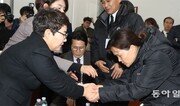 태안 화력발전소 사고로 숨진 김용균 씨의 어머니 김미숙 씨(오른쪽)가 24일 국회 환경노동위원회 고용노동소위원회 회의장에서 자유한국당 임이자 의원(왼쪽)의 손을 잡고 산업안전보건법 개정안(일명 ‘김용균법’) 통과를 호소하고 있다. 이날 회의장 방문에 앞서 김 씨는 더불어민주당 이해찬 대표, 한국당 김병준 비상대책위원장을 잇달아 만나 “이 법이 통과되지 않으면 우리 아들들이 또 죽는다”며 울먹였다. 하지만 이날 여야는 환노위 노동소위에서 김용균법 처리 합의 도출에 실패했고 26일 다시 만나 논의를 이어가기로 했다. 김동주 기자 zoo@donga.com}