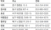 대구시와 대구시약사회는 휴일 없이 연중 문을 여는 ‘365일 약국’ 7곳을 지정해 운영한다. 달성군을 제외한 7개 구별로 1곳씩 지정됐다. 운영 시간은 오전 9시∼오후 8시이다. 심야약국은 대구시약사회관 별관 1층(수성구 황금동·053-768-3679)에 있으며 오후 10시∼오전 6시에 문을 연다. 자세한 내용은 대구시약사회 홈페이지(www.daeguyak.net)를 참조하면 된다. 119종합상황실도 약국 상황을 안내해준다. 장영훈 기자 jang@donga.com}