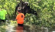 허리케인 아이다가 덮친 미국 남부 루이지애나주에서 커다란 소가 약 2m 높이의 나무 위에 걸려 있다가 당국에 구조됐다.1일(현지시간) US투데이 등에 따르면 루이지애나주의 세인트 버나드 패리시 카운티는 공무원들이 나무 위에 매달려 있는 소를 구출하는 영상을 트위터 계정에 공유했다.영상 속 검은 소는 사방이 사람 허리 높이까지 물에 잠긴 상황에서 나뭇가지에 위태롭게 매달려 있다. 홍수에 떠내려가다가 가지에 걸려 오도 가도 못하게 된 것으로 보인다.신고를 받고 출동한 구조대원들은 전기톱으로 가지를 잘라내 구출 작업을 벌였다. 구조 영상은 소셜미디어에 빠르게 확산돼 높은 조회수와 ‘좋아요’를 기록했다.일부 네티즌들은 우연히 걸린 게 아니라 영리한 소가 홍수에서 살아남기 위해 스스로 나무에 올라간 것 아니냐고 추측하기도 했다.허리케인 아이다는 지난달 말 루이지애나주 일대를 강타했다. 폭우와 강풍으로 200만 명 이상의 루이지애나 주민들이 정전 사태 등의 불편을 겪었고, 현재까지 최소 7명의 사망자가 보고됐다.박태근 동아닷컴 기자 ptk@donga.com}