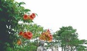 8일 경북 안동시 정상동 능소화 거리에서 시민들이 원이엄마 동상 주변에 핀 능소화를 감상하고 있다. 420년 전 부부의 사랑을 담은 원이엄마 편지로 유명한 사연을 담은 거리다. 안동시 제공}