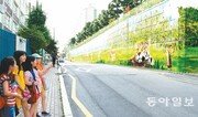 11일 대구 북구 산격동 산격중 담장 벽화를 어린이들이 감상하고 있다. 북구는 4월부터 최근까지 이 학교 담장 280여 m를 동물과 나무, 꽃 그림을 그린 벽화로 꾸몄다. 대구 북구 제공}