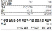 수돗물 값이 생수 가격의 682분의 1 수준인 것으로 나타났다. 수돗물 값이 가장 비싼 곳은 강원 정선, 가장 싼 곳은 경북 청송으로 조사됐다. 국토교통부는 수자원과 관련된 138개 통계를 담은 ‘통계로 보는 한국의 수자원’을 23일 발간했다. 통계집에 따르면 2014년 현재 전국 평균 상수도 요금은 t당 667원이었다. 수돗물 값과 비교하면 생수(t당 45만5000원)는 682배, 콜라(172만 원)는 2579배, 우유(252만 원)는 3779배 비싼 것으로 나타났다. 가구당 월평균 상수도 요금은 1만3264원으로 통신 요금(월평균 12만4741원)의 9분의 1 수준이며 다른 공공요금보다 크게 낮은 편이었다. 상수도 보급률이나 요금 등은 지역별로 차이가 있었다. 서울 등 도시 대부분은 수돗물 보급률이 100%였지만 충남 태안은 76.3%에 불과했다. 수도 요금이 전국에서 가장 비싼 곳은 강원 정선(t당 1457원), 가장 싼 곳은 경북 청송(327원)이었다. 한편 한국인은 가정용수 기준으로 하루 평균 178L의 물을 사용하는 것으로 나타났다. 국내 물 산업은 약 45조 원 규모로 국내총생산(GDP)의 3% 수준까지 성장했다. 통계집은 국토부(www.molit.go.kr) 및 한국수자원공사 홈페이지(kwater.or.kr)에서 내려받을 수 있다.구가인 기자 comedy9@donga.com}