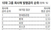 10대 대기업 중 현대중공업의 신용도가 가장 높은 것으로 조사됐다. 가장 낮은 곳은 한진그룹이었다. 29일 기업 경영성과 평가 사이트인 CEO스코어가 지난해 7월부터 올해 8월 24일까지 국내 10대 그룹 소속 상장사 46곳의 회사채 발행 실적을 분석한 결과에 따르면 현대중공업은 3차례 1조2000억 원을 평균 연 3.51%의 금리로 발행했다. 이는 조사 기간 10대 그룹이 발행한 회사채 가운데 가장 낮은 금리다. 2위는 롯데그룹으로, 롯데쇼핑 롯데제과 롯데칠성음료 호남석유화학 등 4개 계열상장사를 통해 9차례에 걸쳐 평균 금리 3.53%로 1조8900억 원어치의 회사채를 발행했다. 3위는 삼성그룹이었다. 삼성은 호텔신라 삼성물산 삼성정밀화학 삼성중공업 삼성테크윈 제일모직 등 6개사에서 19차례에 걸쳐 9조1400억 원 규모의 회사채를 발행했고, 평균 금리는 4.04%였다. 이어 포스코그룹(4.07%) SK그룹(4.09%) GS그룹(4.13%) 현대자동차그룹(4.15%) 한화그룹(4.16%) LG그룹(4.20%) 순으로 뒤를 이었다. 한진그룹이 발행한 회사채의 평균 금리는 4.88%로 가장 높았다. 한국투자증권 채권운용 담당자는 “회사채 발행 금리가 낮다는 것은 그만큼 시장에서 회사의 재정적인 신용도가 높다는 것을 의미한다”며 “현대중공업은 글로벌 조선 1위 입지에 맞게 신용도가 높아 저금리에 회사채를 발행할 수 있었다”고 설명했다. 한편 이 기간 국내 10대 그룹이 발행한 회사채는 25조8800억 원 규모로, 국내 발행 총 회사채 64조9800억 원의 40%였다.김현지 기자 nuk@donga.com}