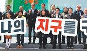 19일 서울 용산구 이촌한강공원에서 열린 기후변화주간 개막식에서 참석자들이 ‘나의 지구를 구해줘’라고 적힌 피켓을 들고 기념촬영을 하고 있다. 이 중 ‘지구를’이라고 쓰인 피켓을 박원순 서울시장과 조명래 환경부 장관, 이은희 한국기후환경네트워크 상임대표(오른쪽부터)가 들고 있다. 이날 조 장관과 참석자들은 느릅나무, 이팝나무 등 나무 505그루를 심었다. 505그루는 ‘SOS, 나의 지구를 구해줘’란 이번 기후변화주간 슬로건의 ‘SOS’를 상징하는 숫자다. 환경부는 22일 지구의 날을 맞아 25일까지 기후변화주간을 운영한다. 최혁중 기자 sajinman@donga.com}