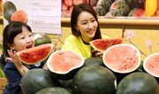 6일 서울 중구 롯데마트 서울역점에서 모델들이 검은색 껍질이 특징인 ‘흑미수박’을 소개하고 있다. 흑미수박은 수박 특유의 줄무늬가 적고 높은 당도와 아삭한 식감을 가진 것이 특징이라는 게 롯데마트 측의 설명이다. 5∼6kg짜리는 1통 1만4900원.최혁중 기자 sajinman@donga.com}