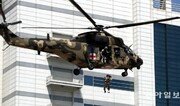 28일 경기 파주시 LG디스플레이 단지에서 ‘2019 을지태극연습’의 일환으로 범국가적 대형 복합 위기상황 발생을 가정한 국가위기대응연습을 실시했다. 진도 6.9의 지진으로 건물이 무너져 사상자가 발생하고 유해화학물질이 유출됐을 시를 가정했다. 11화생방대대 파주소방서 파주경찰서 한국가스안전공사 한국산업안전보건공단 등 30여 개의 재난관리책임기관(민·관·군 유관기관)등으로 약 600여명이 참여했다. 1부 훈련 상황은 유해화학물질 유출사고 상황으로 화재진압, 주민대피, 파주시 재난현장통합지원본부 가동(파주시 부시장 주재), 하천 방제 상황 등이 진행됐고 2부 훈련 상황은 건물 붕괴에 따른 인명구조 상황으로 특전사 헬기레펠 구조 작업이 이뤄졌다. 파주=최혁중 기자 sajinman@donga.com}